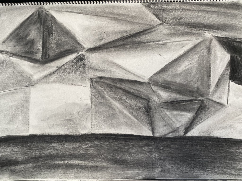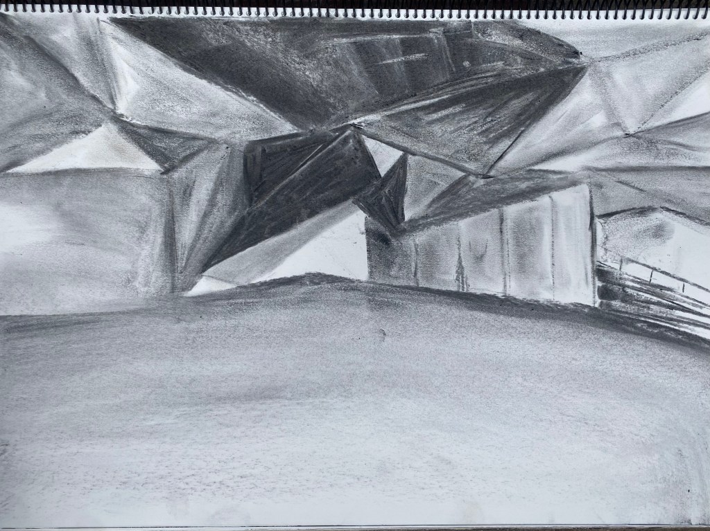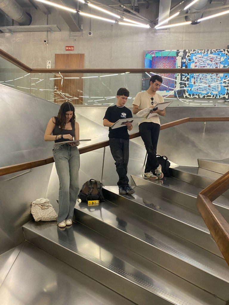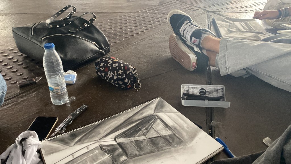 Me parece un edificio muy interesante, porque da la impresión de estar levitando sin nada que lo sujete. Tras varios dibujos y un buen rato fuera, entramos para explorarlo también por dentro. Nos sorprendieron más triángulos, cuadros de arte moderno y un vigilante que no parecía fiarse de nosotros y de nuestras manos manchadas de carboncillo.