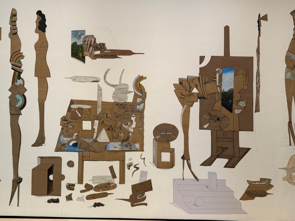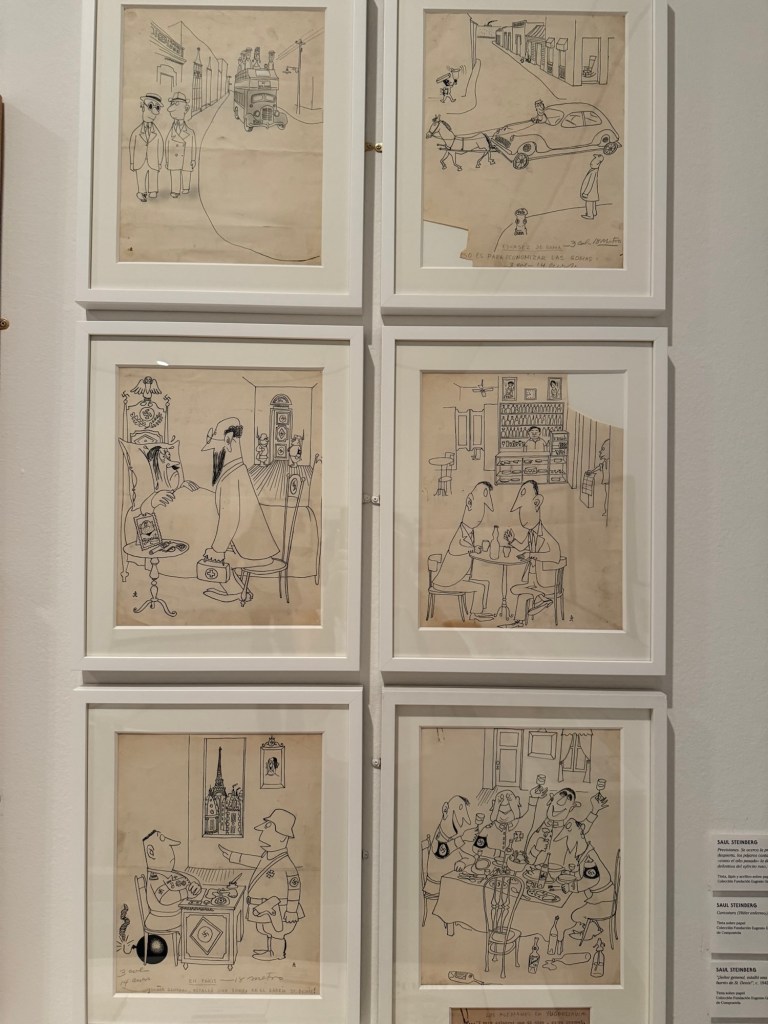La exposición incluía un collage de Saul Steinberg, donde mezcla dibujos y recortes de papel, creando imágenes extrañas que combinan lo real con lo imaginario. Lo que me ha gustado es cómo usa materiales sencillos para crear algo divertido y diferente.