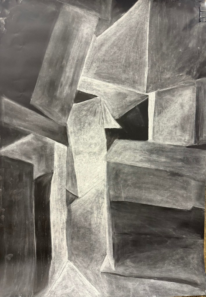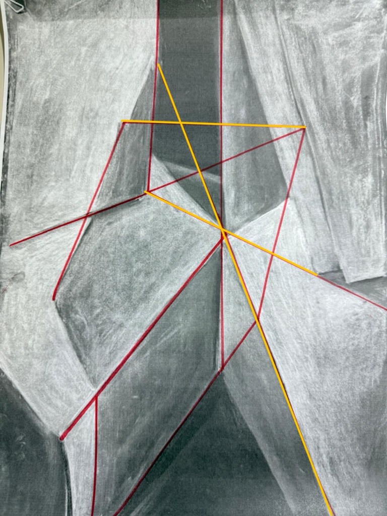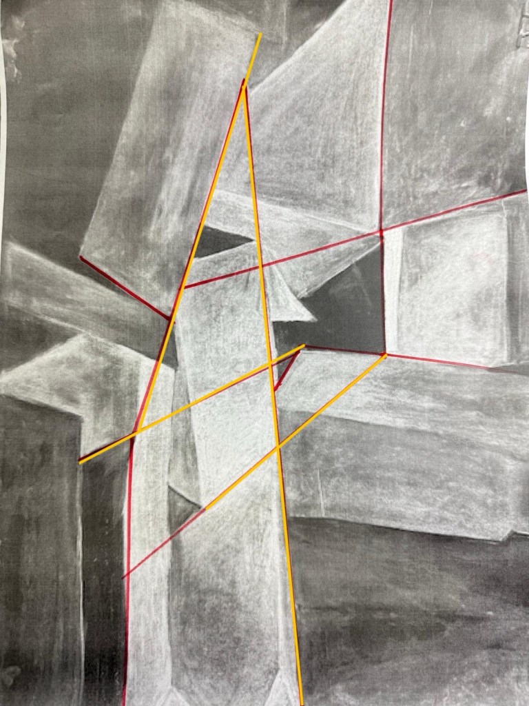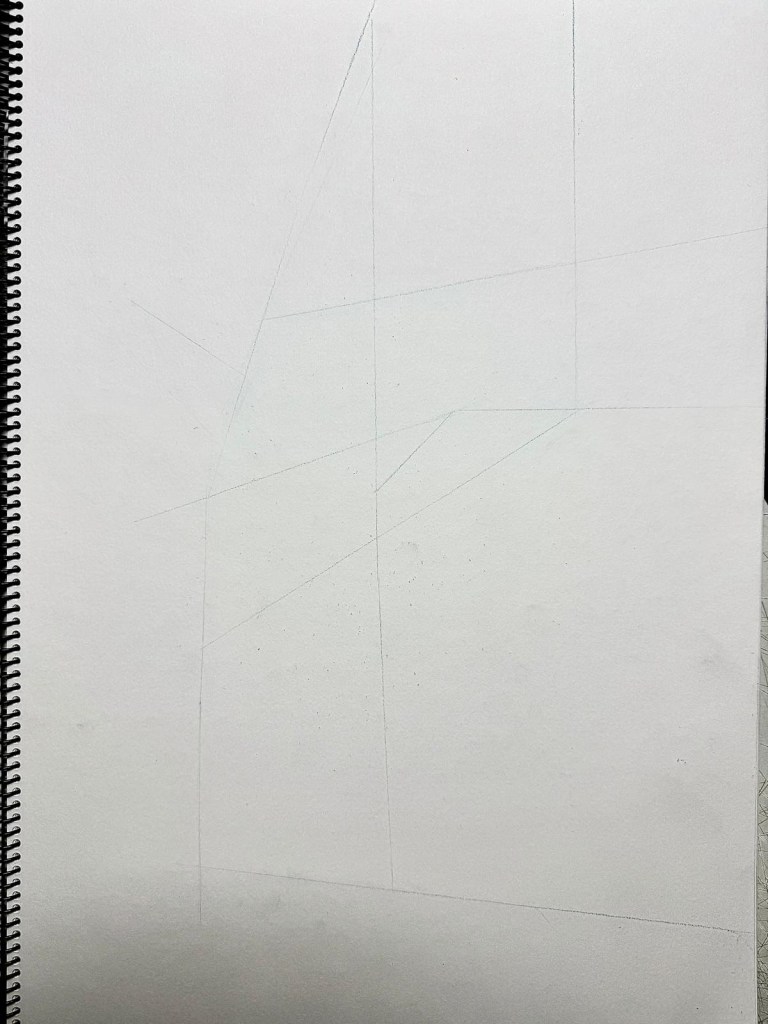 Después, trasladé esas líneas obtenidas de la geometrización a un A3 en blanco, con líneas finas (igual demasiado finas, viéndolas ahora en las fotos). Es que no quería que se vieran mucho en los bajorrelieves.