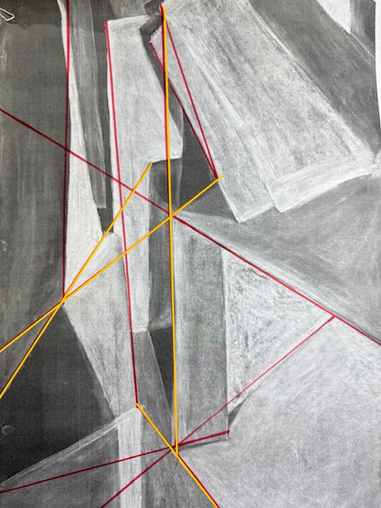 A continuación he realizado la geometrización de los espacios. He empezado marcando algunas de las líneas visibles de los dibujos, pero conforme cogía más confianza comencé a alargar líneas y a buscar conexiones en el propio dibujo, líneas imaginarias que unían diferentes partes.