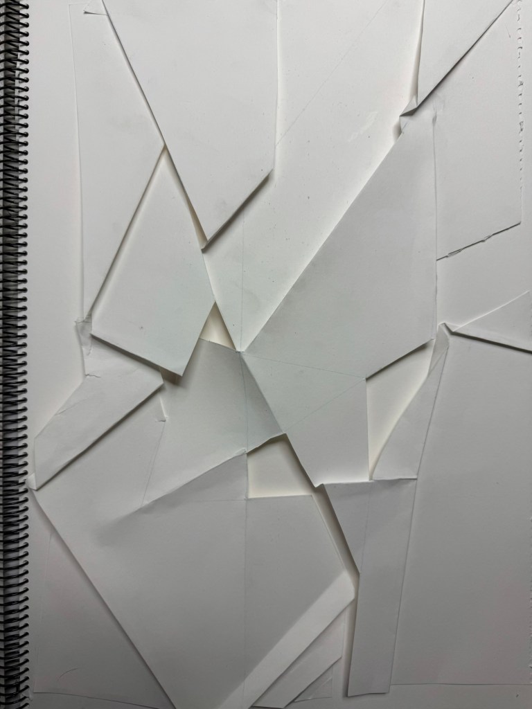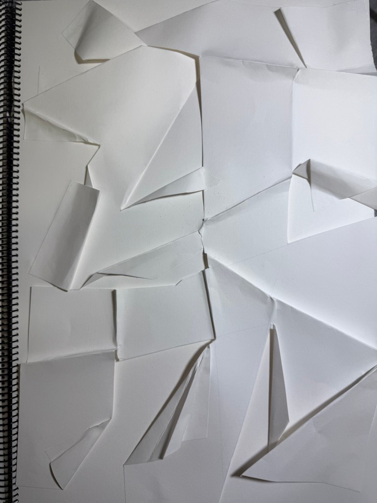 Comencé cortando ciertas de las líneas dibujadas, sin seguir un patrón claro. Luego, guiándome de las líneas fui creando dobleces en el papel, y conforme iba avanzando en el bajorrelieve empecé a pasar de las líneas. Sin darme ni cuenta estaba cortando y doblando como me daba un poco la gana, buscando relieves interesantes.