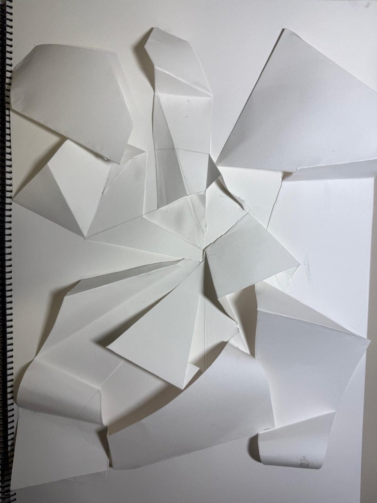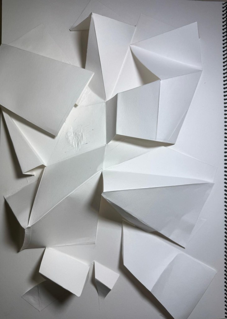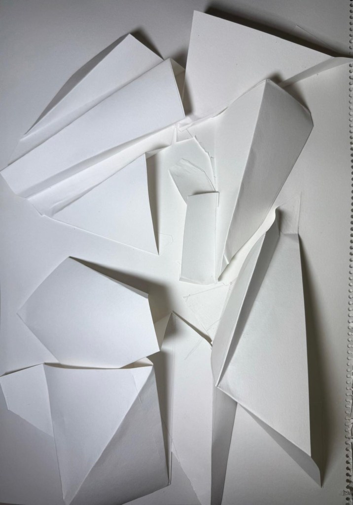 Total, que básicamente he seguido el mismo procedimiento que en los bajorrelieves, cortando por algunas líneas de la geometrización y doblando por otras, generando distintas estructuras en el papel. La diferencia es que esta vez he realizado relieves más elevados. YYY aquí están mis resultados 🙂