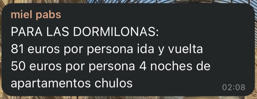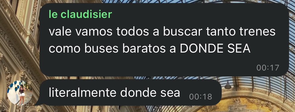 Y así estuvimos un bueeeeen rato. Era de madrugada y solo quedábamos Clau, Pabs y yo, dándolo todo con la búsqueda de trenes. Eran casi las 2 cuando por la cara Pabs mandó un enlace de vuelos. “Se le ha ido”, pensamos Clau y yo. Pero entonces lo vimos.