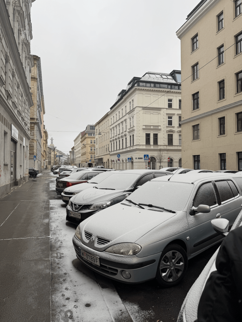 Nuestra primera noche en Viena dormimos calentitos en nuestro pisito, y nos despertamos al día siguiente para encontrar nieve en los coches. ¡¡¡¡NIEVEEEEE!!!!