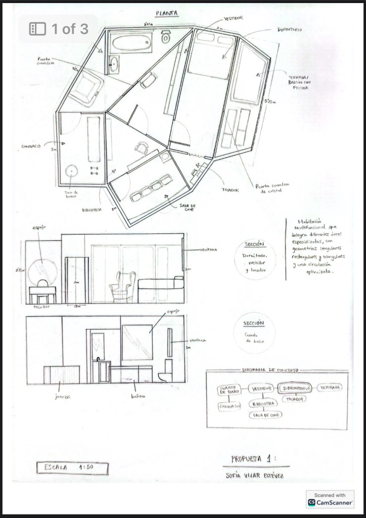 Total, que luego pidieron el verdadero trabajo: tres láminas A3 con tres diferentes propuestas de habitación. Yo me las curré fleje.