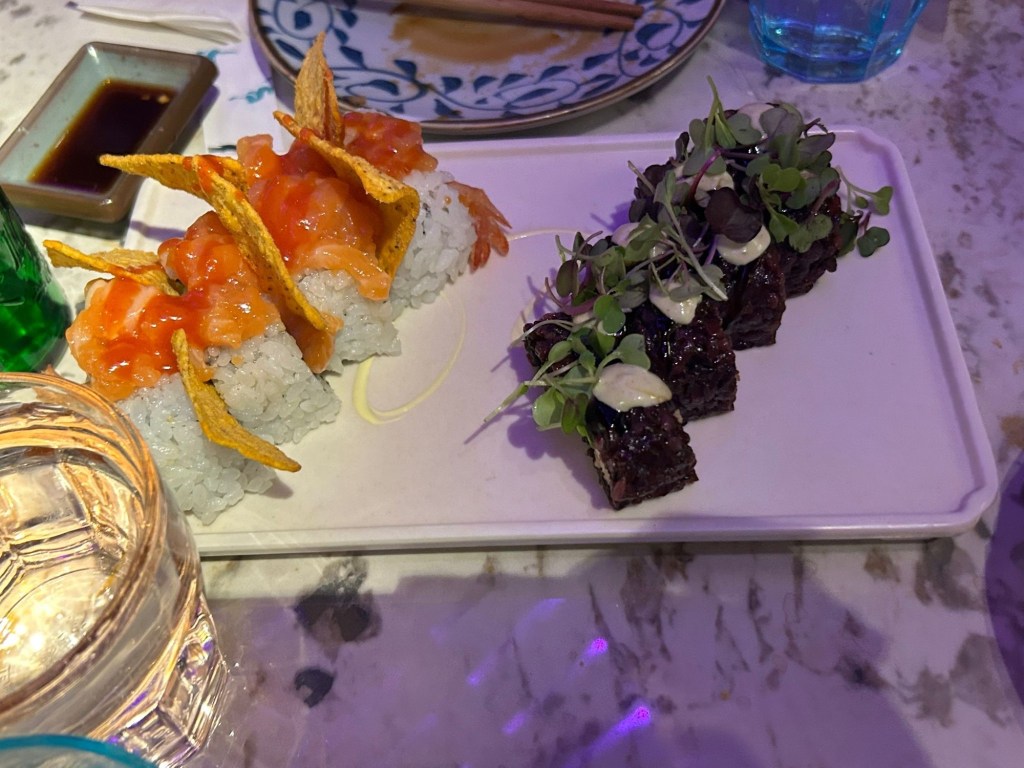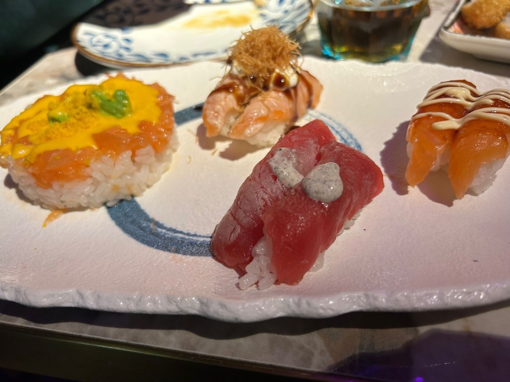 Mis padres nos llevaron a un sitio chulísimo y nos hinchamos a nigiris, makis, gyozas y sashimi. Estaba todo BUENÍSIMO. Además, los kinkis se ganaron el corazón de mis padres, sacando a la luz su encanto natural y contándoles miles de historias. Y llevándoles hasta regalos!!! Un vinito y unas flores, mis padres estaban encantados.