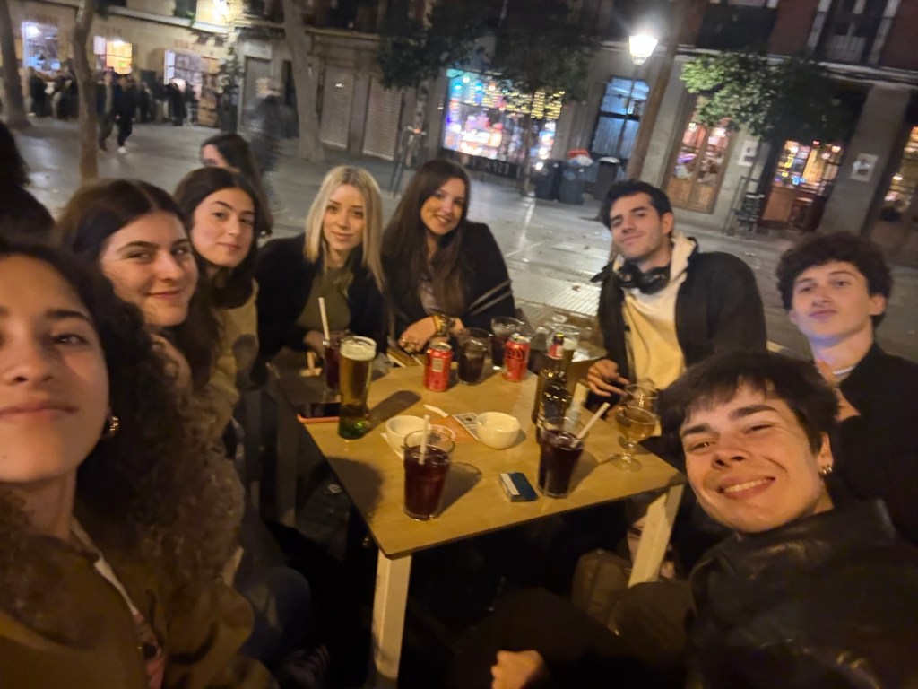 Luego nos trasladamos a nuestro sitio de confi: el 100Montaditos. Siempre está ahí para ofrecernos jarras baratas. Cenamos ricas bolitas de queso y montaditos de jamón, y conectamos mucho con nuestras nuevas mejores amigas.