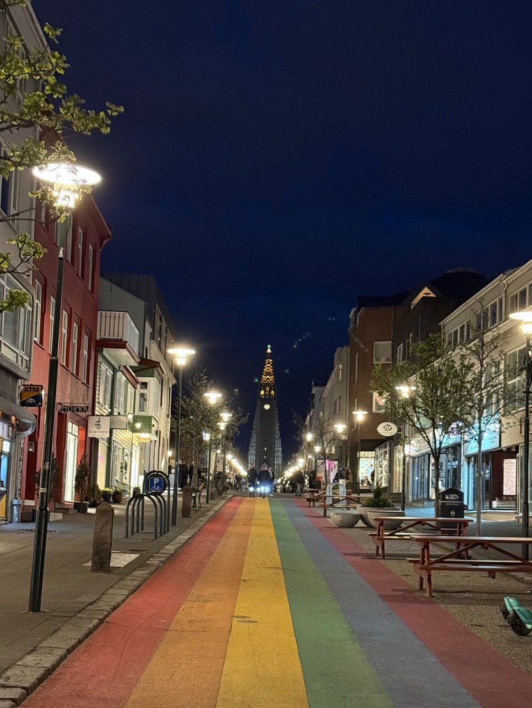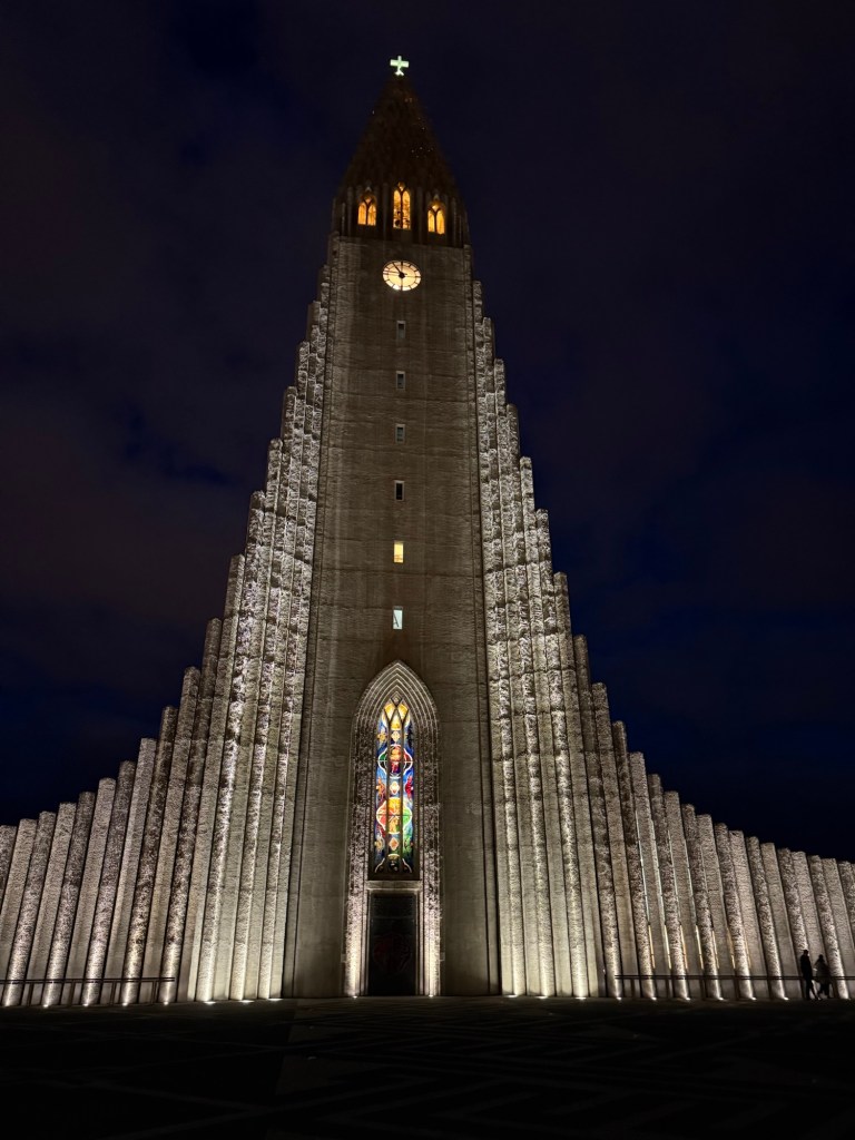 Esa noche, como despedida, dimos un paseito por Reykjavík, y vimos la iglesia Hallgrímskirkja, que de frente parecía estar en 2D, no me imaginaba qué habría al rodearla. Por lo visto es arquitectura brutalista que imita la lava fluyendo, y la verdad que daba mucha impresión.