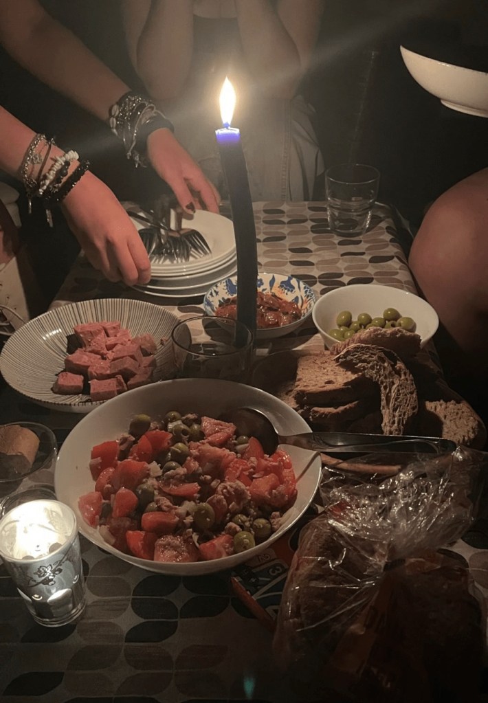 Erika y Javi nos prepararon una fantástica cena que nos supo a GLORIA. Pan, aceitunas, ensalada, mejillones, dados de jamón. Comimos en la terraza porque hacía un clima ideal, bajo las estrellas que veíamos por la ausencia de contaminación lumínica. Fue una romántica cena a la luz de las velas.