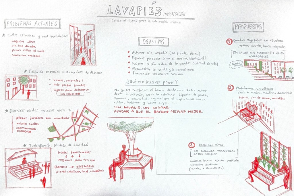 Empiezo con mi análisis del barrio de Lavapiés, en el que saqué conclusiones de los problemas actuales, los que más relevantes me parecían a mí personalmente y los objetivos a cumplir. En general me importa crear una red de estructuras sencillas, desmontables y alterables que mejoren la calidad de vida y transformen Lavapiés en un lugar más agradable.